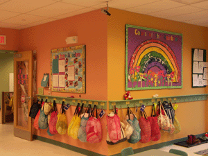 Color is a dominant feature in the scheme. The infant room is a restful sage green; all other spaces are playfully animated by varying combinations of pumpkin, yellow, ochre, sea green and mauve. A finishing touch is the built-in aquarium at the wall between Infants and Toddlers, only 18” above the floor so children can easily view the fish.