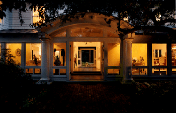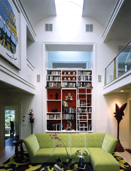 The project incorporated the existing barn structure with new ridge skylights, a glazed dormer balcony, an oval atrium stairwall, and the iconic two-story conical bay window to bring natural light into all corners of the interior. The original sliding barn doors were converted into sliding screen doors over new glass French entrance doors.