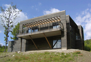 Each unique design addresses its site, altitude and panoramic views with southern passive solar and view-oriented, full-height glass window walls. With maintenance-free or native species exteriors and ultramodern fixtures and finishes throughout, the residences were conceived with sustainable technology and materials, FPSF foundations, super-insulated panelized and truss frame construction, and insulated fiberglass doors and windows.