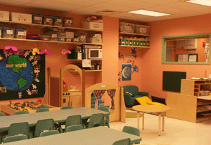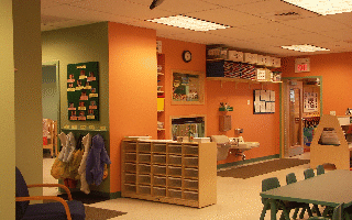 Color is a dominant feature in the scheme. The infant room is a restful sage green; all other spaces are playfully animated by varying combinations of pumpkin, yellow, ochre, sea green and mauve. A finishing touch is the built-in aquarium at the wall between Infants and Toddlers, only 18” above the floor so children can easily view the fish.