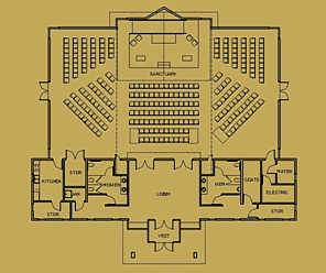 The third piece is an existing house which has been used for offices, school and sanctuary since the congregation started. This structure will be revised for offices and painted to match the new sanctuary.