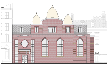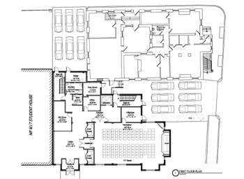 This project is an addition to their facility and represents a new home for the center's public uses including a meditation hall, multi-purpose room, kitchen and guest quarters. The original structure will revert to a private residence for the Swami. The design is crafted to be respectful of the existing structure. To accomplish this, the masses are similar in bulk and the new building is tailored to enable the original house to be seen from the street. The addition features arched windows and a series of conical domes to evoke the feeling of Eastern worship.