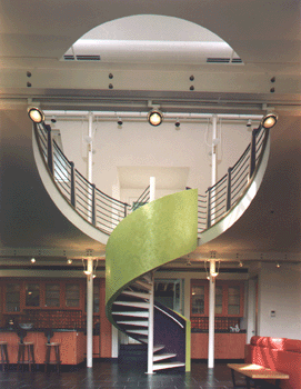 Amenities include a private guest suite, open lower floor music recital hall with stage, Brazilian tiled var and kitchen, and upper floor executive office and conference suite. Interior materilas and techniques were carefully detailed to maintain the finest acoustic control, isolation and separation leading to the conical bay window form.